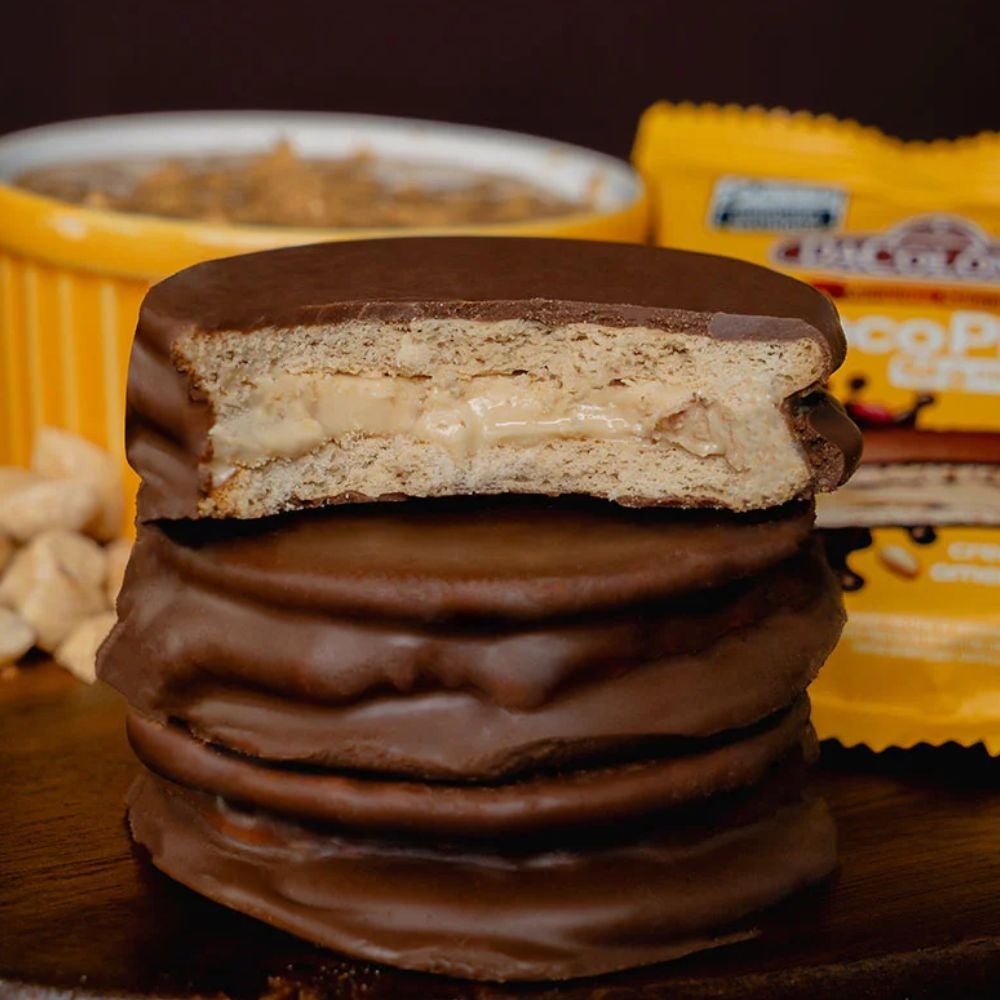 Alfajor proteico com recheio de creme de amendoim e cobertura sabor chocolate, sem adição de açúcar, sem lactose e com 9,6g de proteína por unidade.