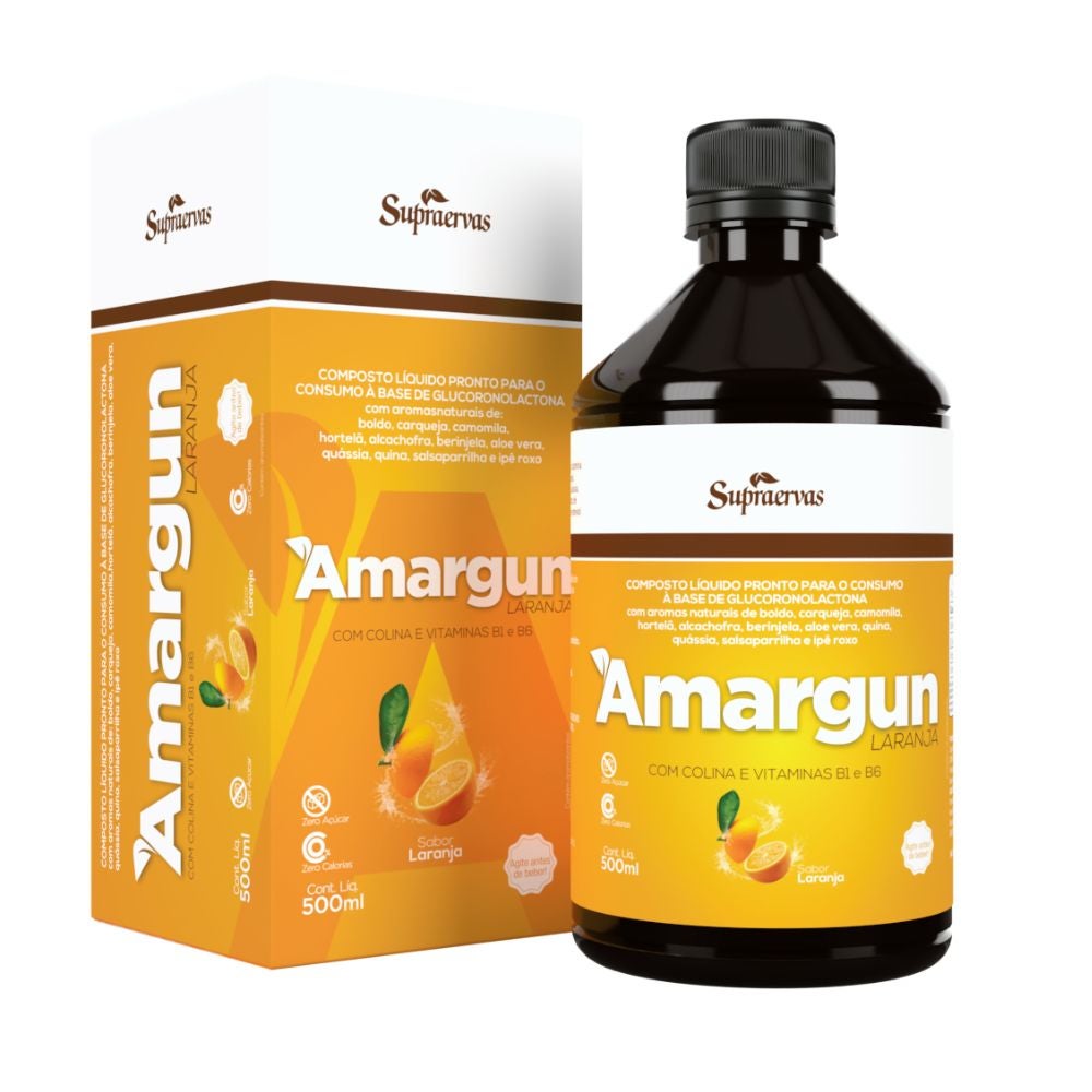 Amargun é um chá amargo feito com diversos ingredientes como boldo, carqueja, camomila, hortelã, alcachofra, berinjela, aloe vera, quássia, quina, salsaparrilha e Ipê Roxo. Sabor Laranja, mais agradável para o paladar.