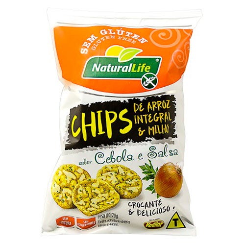O Chips da Natural Life é feito de Arroz Integral e Milho, naturalmente livre de glúten. Com textura crocante e saborosa. Não é frito e nem assado, é uma inovação de snack mais natural e saudável. Sabor Cebola e Salsa.