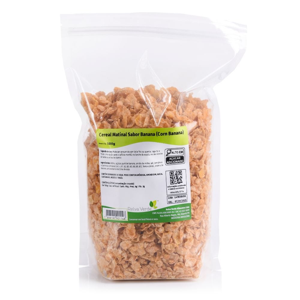 O Corn Banana é um cereal matinal rico em vitaminas, minerais e fibras que proporciona mais saúde, energia, alegria e bem estar para você. Esse cereal matinal de milho é um dos sabores preferidos do brasileiro, Banana. Uma opção para consumir no seu café da manhã, no lanche da escola, no seu lanche da tarde ou antes de dormir. É enriquecido com um complexo vitamínico e mineral sendo fonte de vitamina C, B1, B2, B3, B5, B6, B9, B12, ferro e zinco.