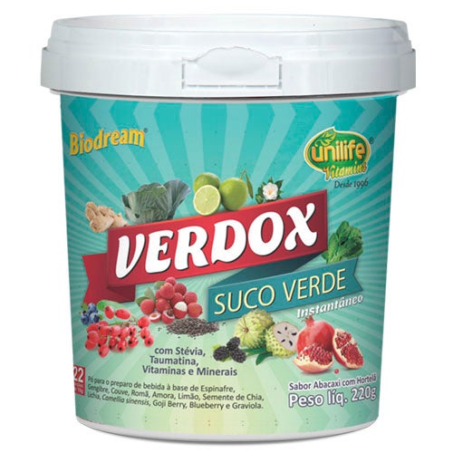 Suco Verde Instantâneo sabor Abacaxi com Hortelã, com Stevia, Taumatina, Vitaminas e Minerais.