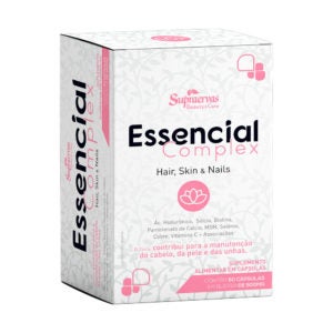 O Essencial Complex é um suplemento de Ácido Hialurônico, Silício, Biotina, Pantotenato de Cálcio, MSM, Selênio, Cobre, Vitamina C e associações como o Vitamina A, B1, B2, B3, B5, B9, B12 e E que auxiliam na manutenção da saúde dos cabelos, pele e unhas.