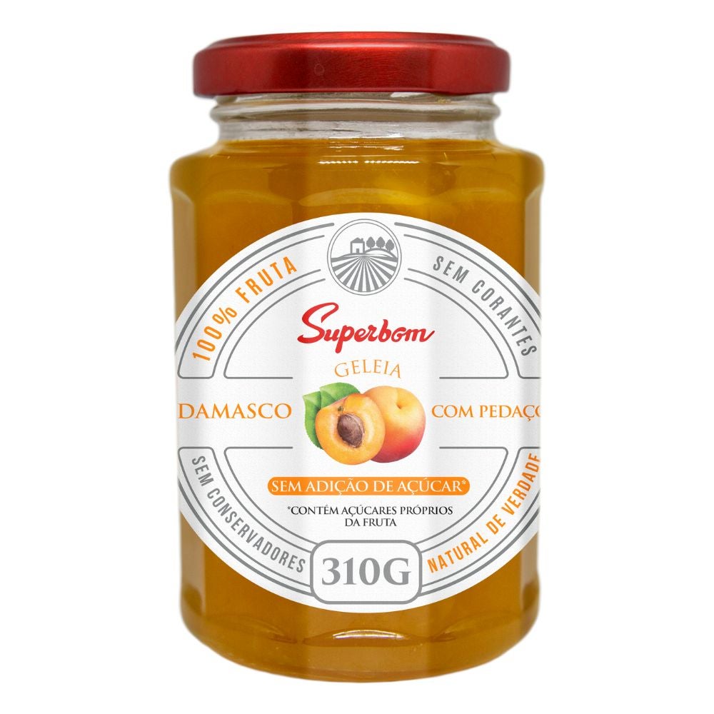 A Geleia de Damasco da Superbom é feita com 100% de fruta e enriquecida com sementes de chia, fonte de fibras solúveis e totalmente natural! Sem conservantes, sem corantes e sem adição de açúcar.