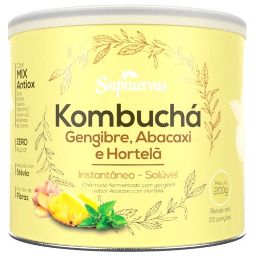 O Kombuchá é o chá verde fermentado com frutas, zero açúcar, adoçado com stévia, alto teor de fibras e com mix antiox composto de zinco, biotina, selênio, vitamina C, Vitamina E e picolinato de cromo. Nessa versão, o Kombuchá é feito com Gengibre, Abacaxi e Hortelã.
