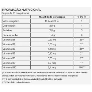 Levedura de cerveja (Saccharomyces cerevisae), amido de arroz, levedura enriquecida com selênio, cianocobalamina e antiumectante dióxido de silício.