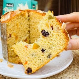 Mix sem glúten (amido modificado, farinha de arroz, fécula de mandioca, farinha de amêndoas, polvilho azedo, proteína isolada de soja, farinha de soja não transgênica), frutas cristalizadas (sem adição de açúcares), óleo vegetal (palma e soja), ovo em pó, uva-passa, fibra solúvel polidextrose, fibra de tapioca, amêndoas laminadas, leite de coco em pó, sal light, psyllium, edulcorantes maltitol e glicosídeos de esteviol, emulsificantes mono e diglicerídeos de ácidos graxos e goma xantana, umectantes glicerol e sorbitol, aromatizantes, acidulante ácido cítrico e conservantes propionato de cálcio e ácido sórbico.