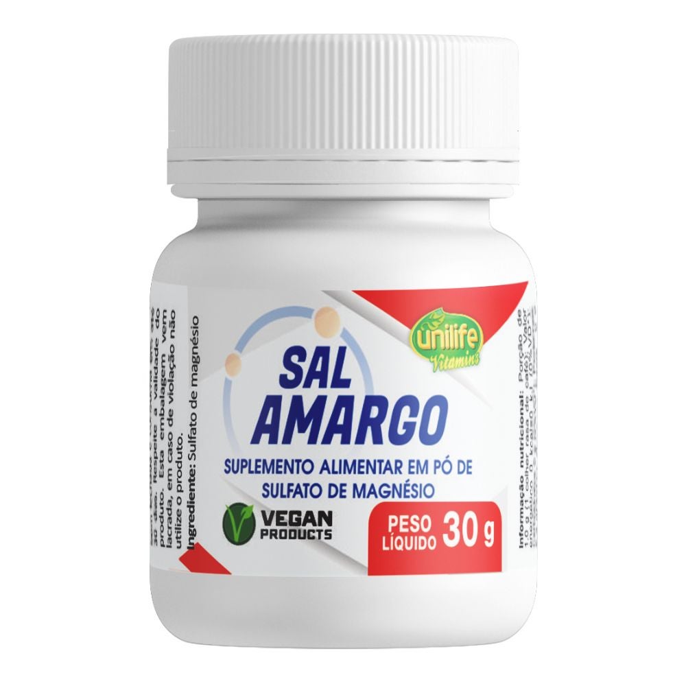 O Sal Amargo é um suplemento alimentar em pó de Sulfato de magnésio, que leva esse nome pelo seu aspecto parecido com o sal e seu sabor amargo. É indicado para pessoas que possuem deficiência de magnésio, para auxiliar no alívio muscular, por ajudar no processo de evacuação tendo função laxante e também pode ser utilizado para o preparo de escalda-pés, compressas e banhos quentes. Chamado também de sal de Epsom.