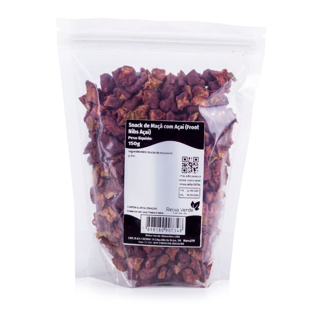 O Snack de Maçã com Açaí, chamado de Froot Nibs Açaí, são pequenos pedaços de maçã desidratados e cobertos com uma calda de açaí! 100% natural, sem nada de conservantes ou corantes artificiais. Uma opção saborosa para saciar a vontade de consumir um docinho após o almoço, para incrementar a sua granola ou cereal, em sorvetes, iogurtes, mix de frutas secas e muito mais. Experimente!