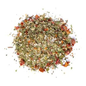 O Vinagrete Desidratado é ótimo para saladas, assados, quibes e recheios. É o resultado da mistura entre ervas e temperos desidratados: Cebola, tomate seco, alho, pimentão vermelho, salsa, cebolinha e orégano. Essa receita é feita exclusivamente pela Relva Verde. Sem adição de Sal.